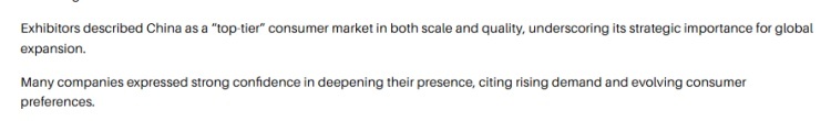 文章稱,許多參展商將中國(guó)描述為兼具規(guī)模與品質(zhì)的“頂級(jí)”消費(fèi)市場(chǎng),并強(qiáng)調(diào)了中國(guó)對(duì)于打開(kāi)全球市場(chǎng)的重要性。許多企業(yè)表示,鑒于不斷增長(zhǎng)的需求和持續(xù)更新的消費(fèi)者偏好,他們對(duì)深耕中國(guó)市場(chǎng)充滿信心。