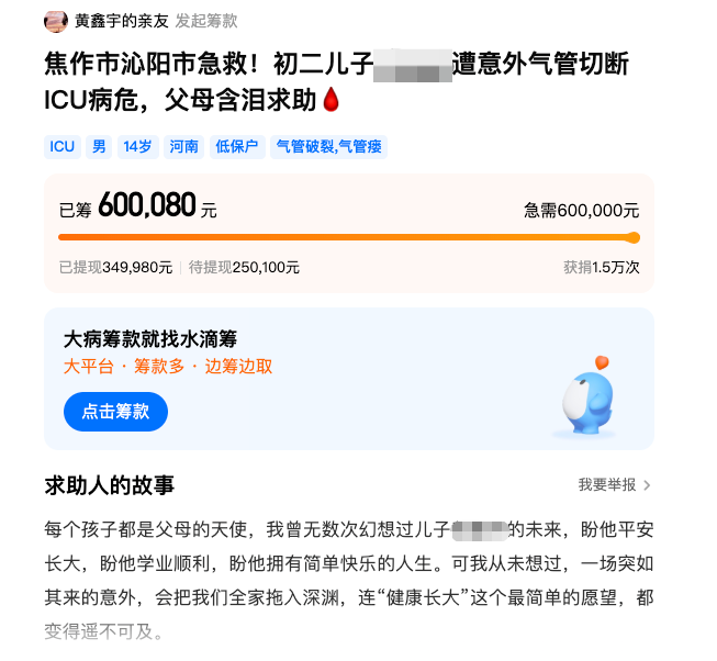 4月14日,記者從水滴籌平臺及小宇家屬處獲悉,男孩已從重癥監護室(ICU)轉入普通病房,此前發起的60萬元籌款已完成,目前正根據治療進展分批提現。