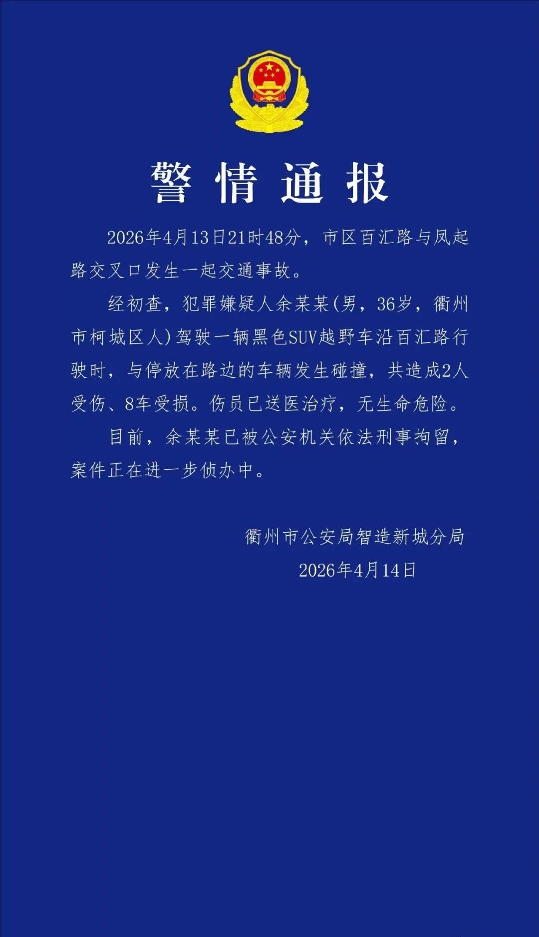 經初查,犯罪嫌疑人余某某(男,36歲,衢州市柯城區人)駕駛一輛黑色SUV越野車沿百匯路行駛時,與停放在路邊的車輛發生碰撞,共造成2人受傷、8車受損。傷員已送醫治療,無生命危險。目前,余某某已被公安機關依法刑事拘留,案件正在進一步偵辦中。