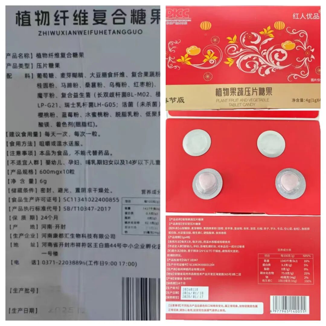 ▲客服提供的“植物纖維復(fù)合糖果”“植物果蔬壓片糖果”配料表。
