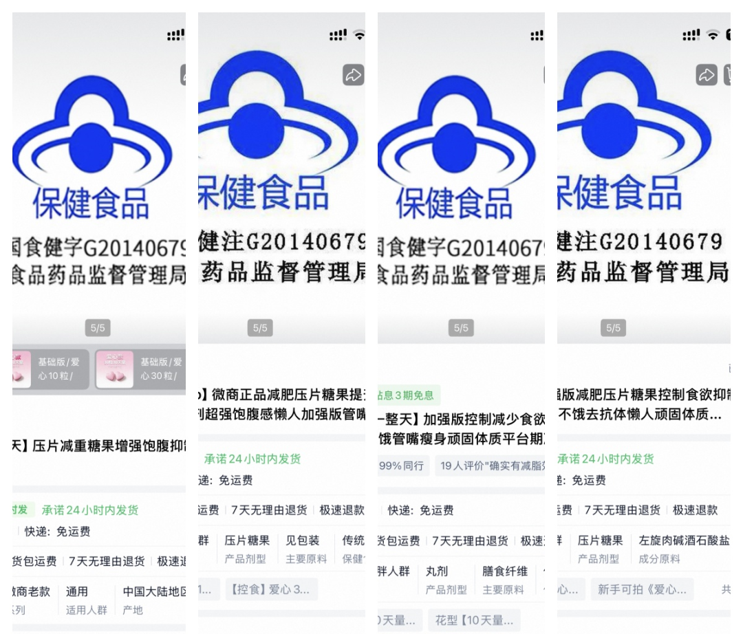 在“實(shí)力廠銷 誠招代理”店鋪,一款名為“【明星模特內(nèi)部專用】加強(qiáng)版古法減肥糖果”的產(chǎn)品頁面中,一張宣傳圖為“藍(lán)帽子”標(biāo)識(shí)和“國食健字G20140679”批號(hào)。而“胖子蛻變館”“微商減肥瘦身店”“伊享瘦”“萬達(dá)國際瘦身”“莉莉 減肥糖果 總銷商”“嘟嘟瘦身小店”等多個(gè)店鋪均有產(chǎn)品使用“藍(lán)帽子”宣傳圖片,不過具體批號(hào)方面,有的產(chǎn)品顯示為“國食健字G20140679”批號(hào),有的顯示為“國食健注G20140679”批號(hào)。