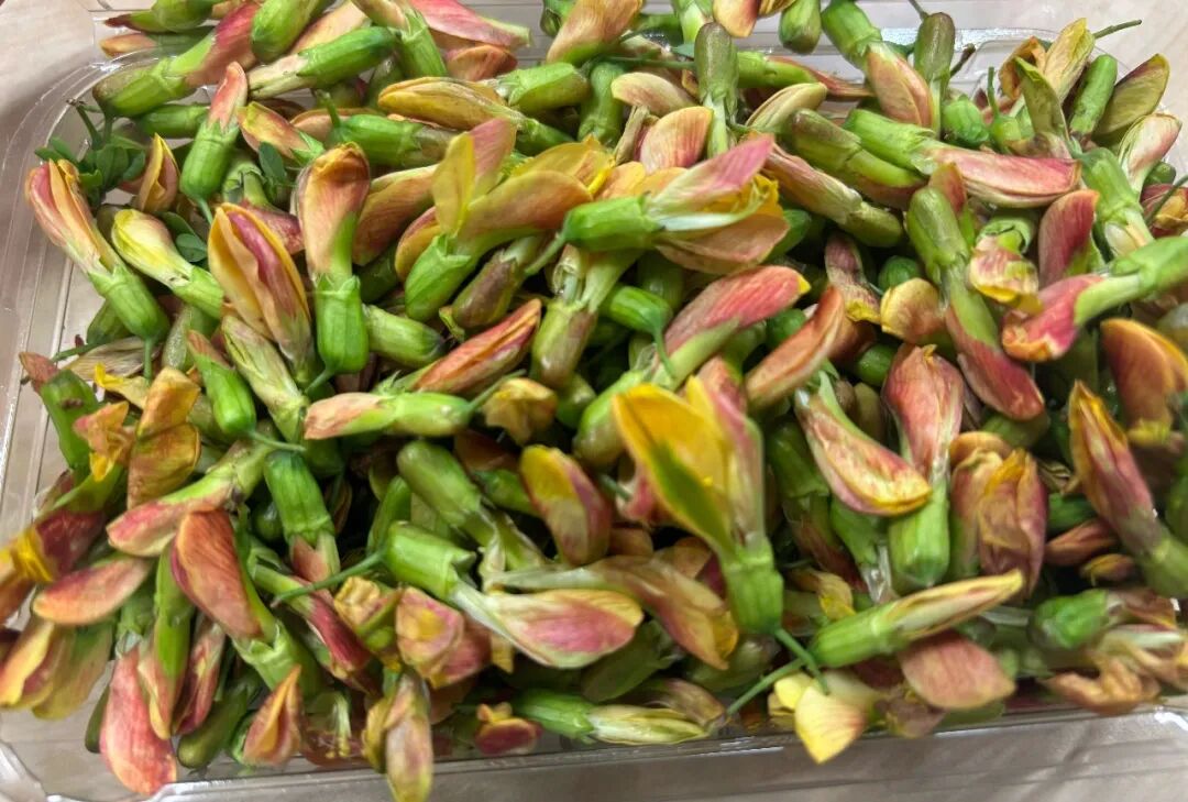 因瓣端稍尖,旁分兩瓣,勢如飛燕,色澤金黃,故名“金雀花”。這個名字可能對很多人來說有點陌生,但它在云南可是家喻戶曉的春季限定美味。每年4月至5月是它的盛花期,也是食用的最佳時節(jié)。金雀花本身帶淡淡清香,吃起來絲絲甜意,鮮嫩嬌脆。