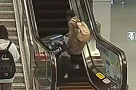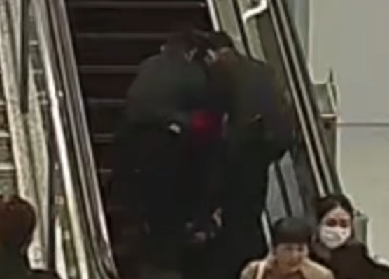 兩名乘客乘坐電動扶梯時