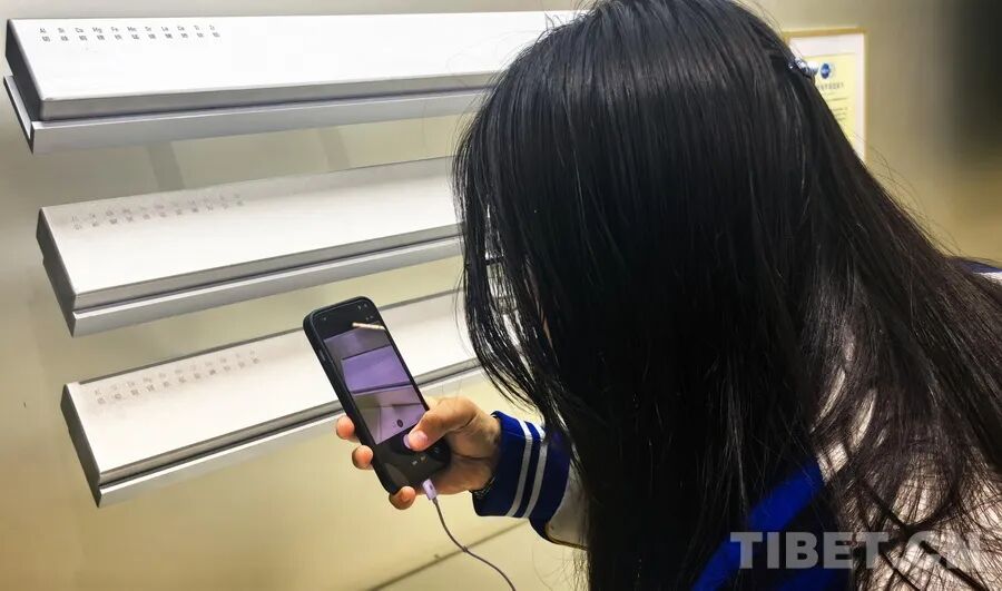 在小米泰坦合金展品前,來自西藏自治區山南市的洛桑曲珍與同學們饒有興趣地閱讀合金的成分說明。