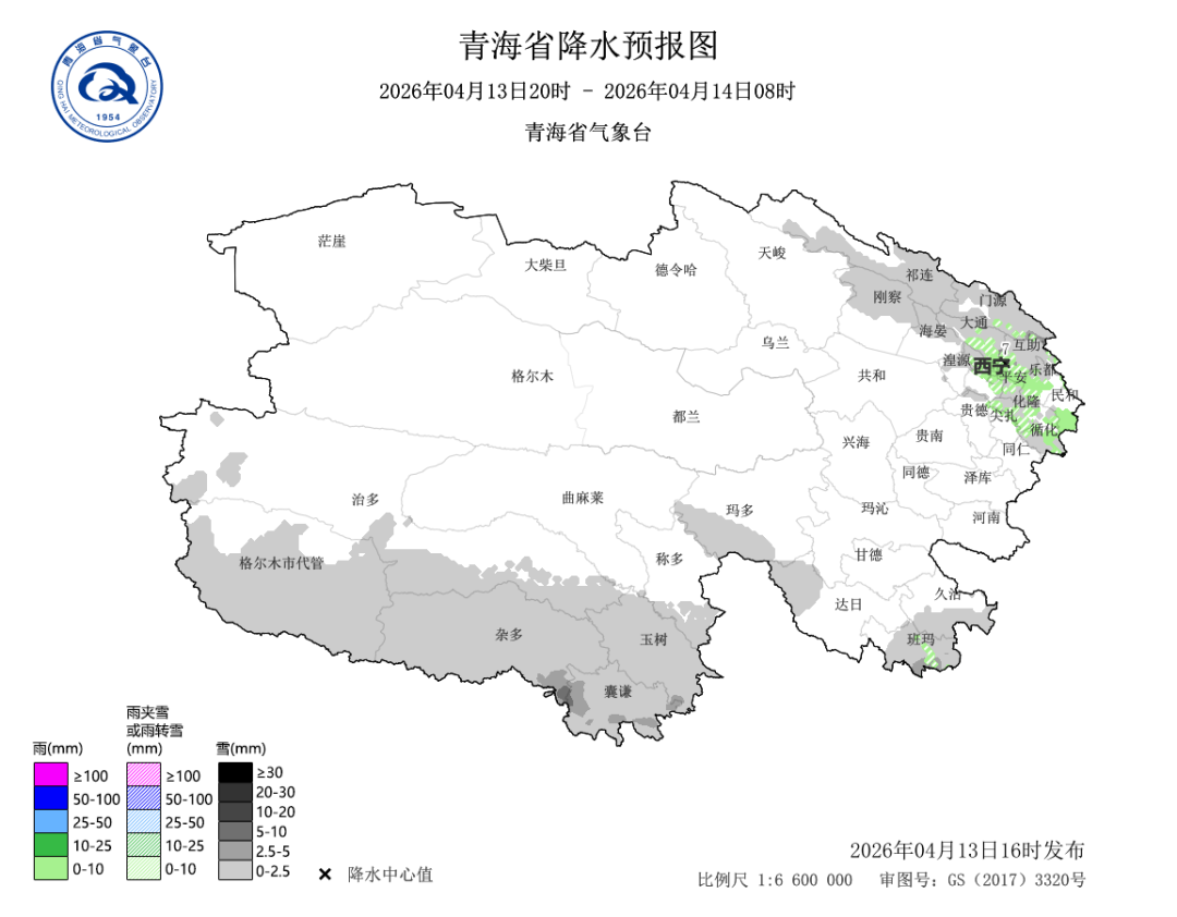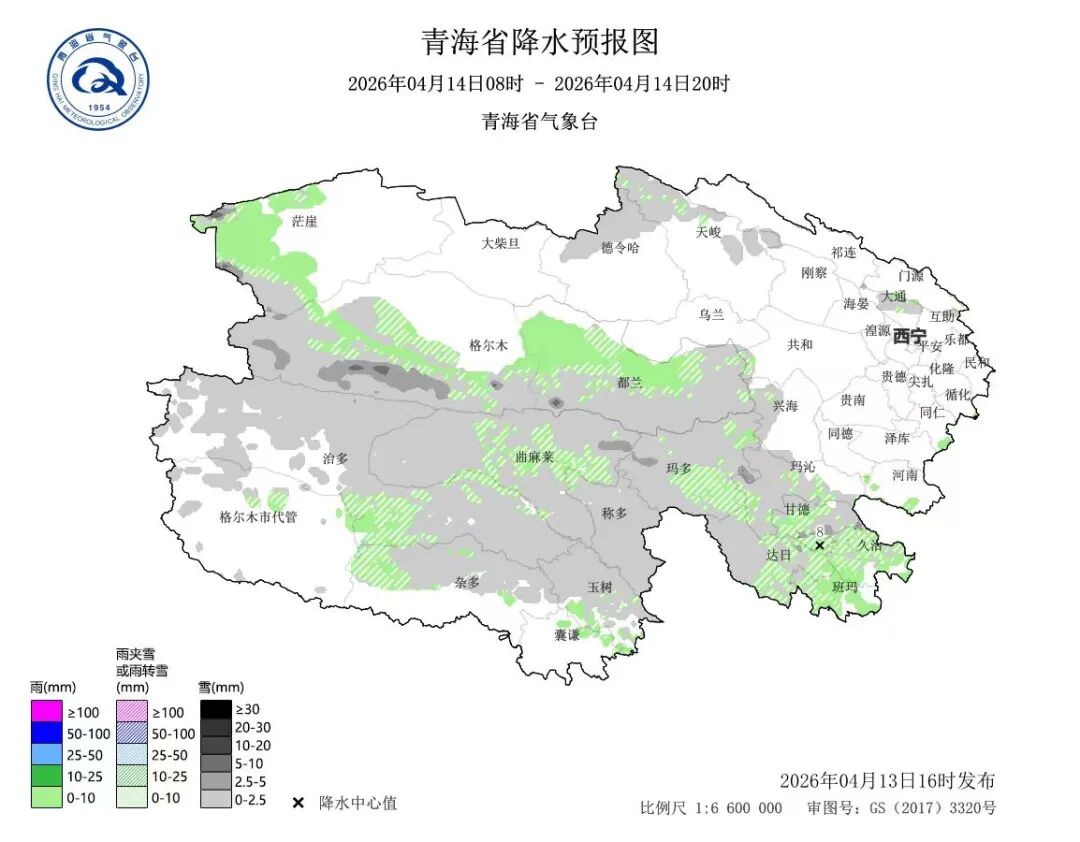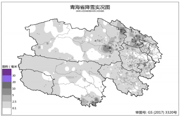4月12日08時(shí)至4月13日08時(shí),全省各地降水量在0.1~15.4毫米之間,其中暴雪16站次、大雪39站次、 中雪89站次、小雪306站次。最大降水量出現(xiàn)在海晏甘子河鄉(xiāng)托華村,降水量為15.4毫米;城鎮(zhèn)最大降水量出現(xiàn)在茶卡,降水量為6.6毫米,最大積雪深度出現(xiàn)在德令哈克魯諾爾村哈爾哈達(dá)郭勒,雪深為11厘米。