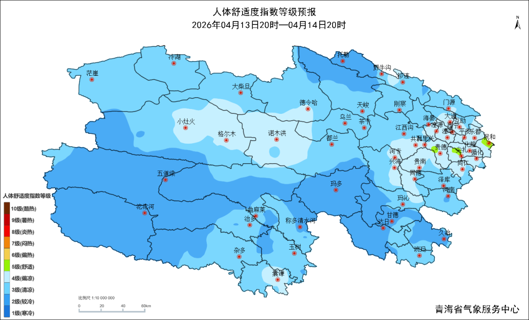 人體舒適度指數(shù):4月13日20時(shí)至4月14日20時(shí):尖扎、民和、貴德地區(qū)為5級(舒適)。省內(nèi)其余區(qū)域?yàn)?級(較冷)~4級(偏涼),注意保暖。