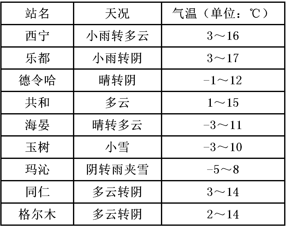 15日20時(shí)-16日20時(shí):海北大部及大通、互助、德令哈、天峻、玉樹市、雜多、囊謙的部分地區(qū)有小雨(雪)或雨夾雪(0.1~5毫米),省內(nèi)其余地區(qū)晴或多云。