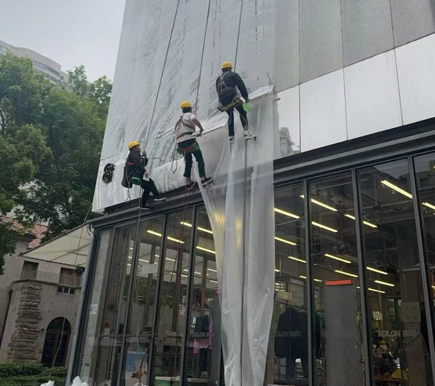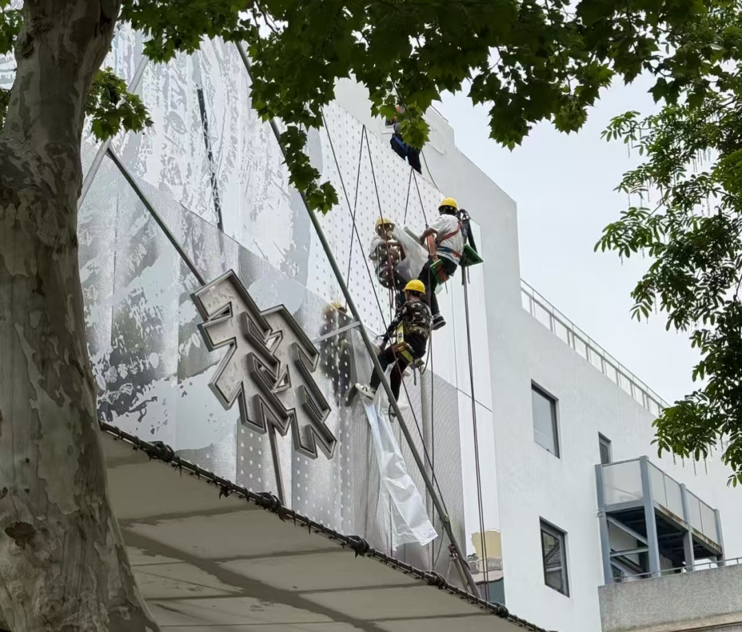 4月17日,網友發布事情最新進展,已看到有工人在給鏡面墻貼防撞貼。