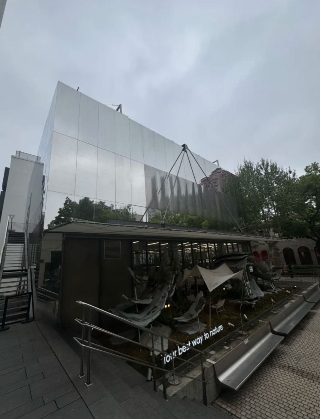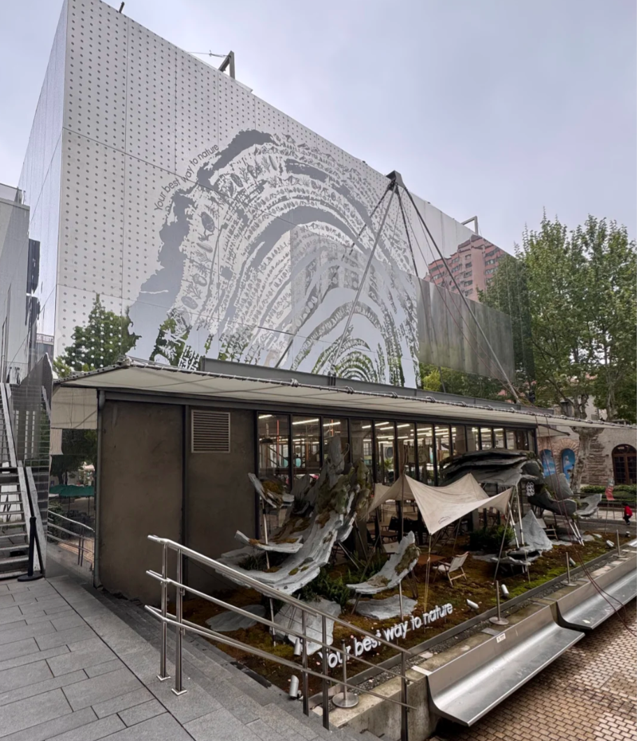 戶外品牌KOLON以常青樹為品牌標志,堅持以關愛自然為己任,演員胡歌為品牌代言人。KOLON 1973是其在上生·新所開設的品牌文化中心店,于2023年4月20日開業。外立面的鏡面設計也是其開業宣傳文案中的亮點。