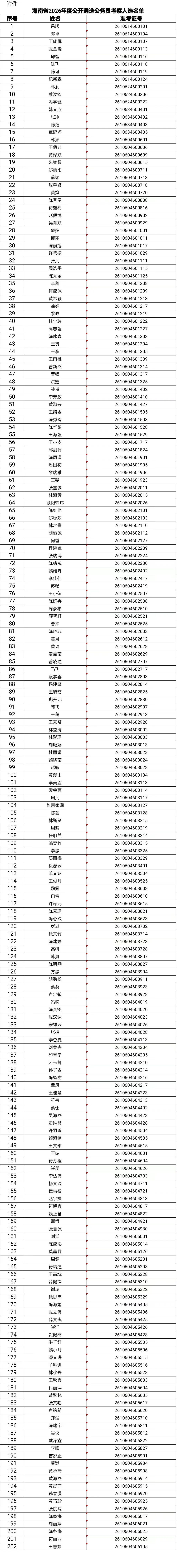 根據海南省2026年度公開遴選公務員工作安排,考試綜合成績及排名可登錄“海南省2026年度公開遴選公務員”網上報名系統進行查詢,現將考察人選名單予以公告。