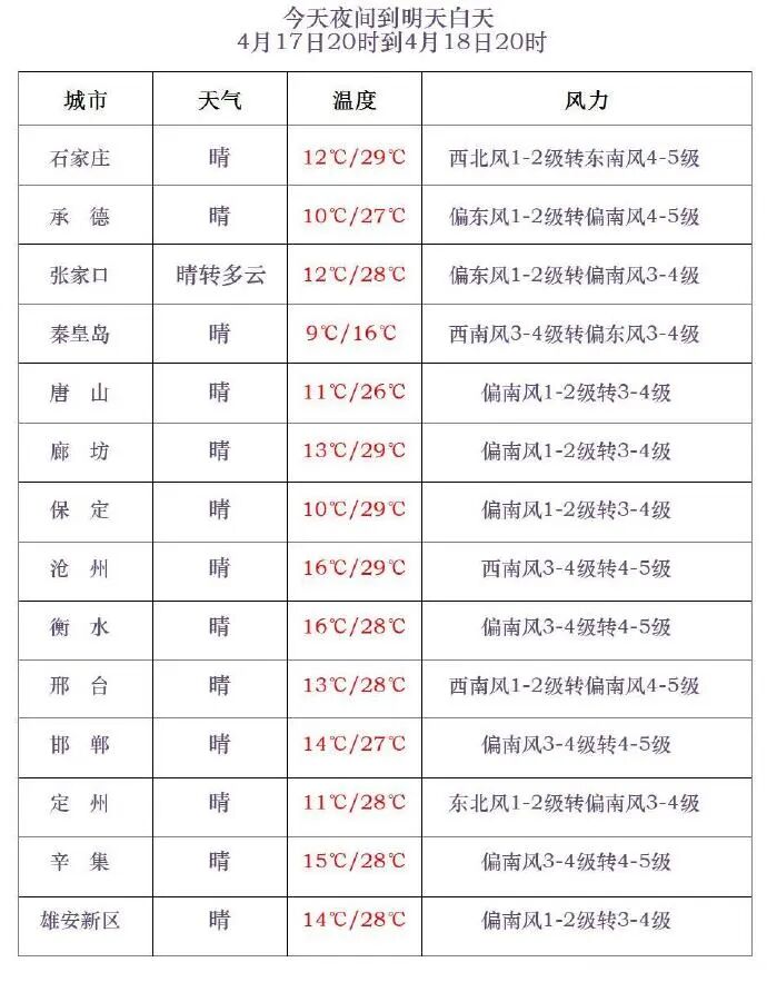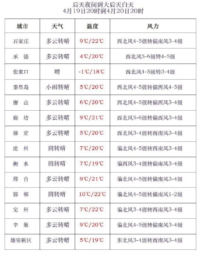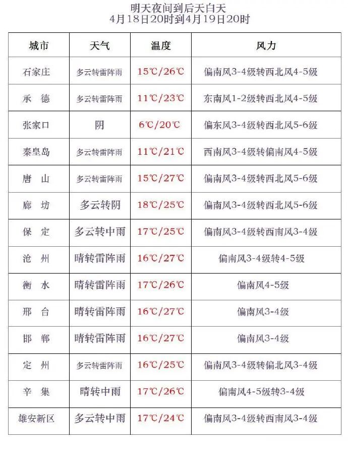 根據(jù)預(yù)報(bào),4月18日后半夜至19日,河北省大部地區(qū)有雷陣雨,保定、廊坊以南地區(qū)個(gè)別地點(diǎn)有大雨,雷雨時(shí)局地伴有短時(shí)大風(fēng)、短時(shí)強(qiáng)降水、冰雹等強(qiáng)對流天氣。19日至20日,全省大部地區(qū)及海區(qū)風(fēng)力較大,并伴有揚(yáng)沙或浮塵天氣。20日早晨,全省大部分地區(qū)最低氣溫明顯下降,局地降幅可達(dá)10℃至14℃。
