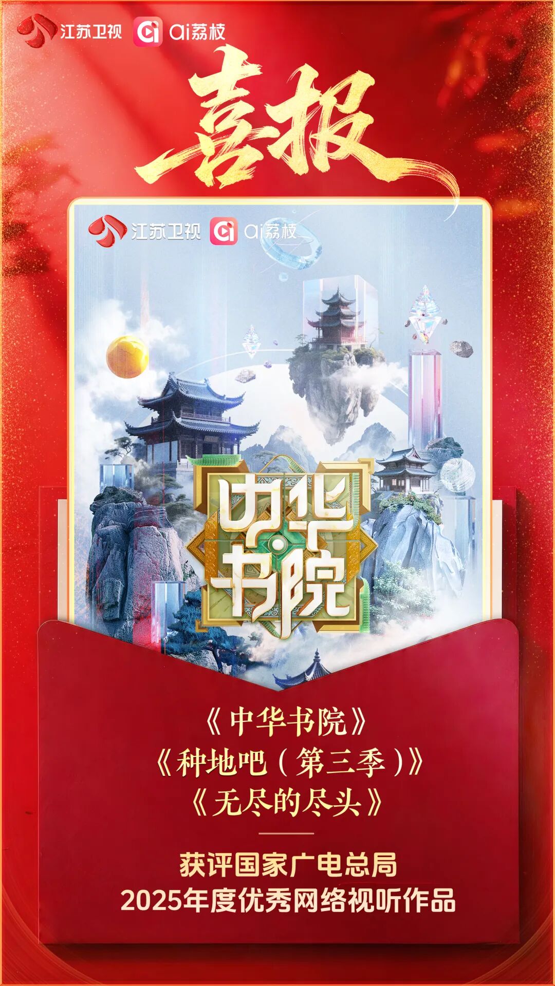 今日,國家廣播電視總局發布通知公布2025年度優秀網絡視聽作品目錄,由江蘇衛視打造的《中華書院》成功入選,同時入選的還有江蘇衛視播出的《種地吧(第三季)》和電視劇《無盡的盡頭》。通知表揚名單中的優秀網絡視聽作品,繁榮互聯網條件下的新大眾文藝,營造良好創作傳播生態。