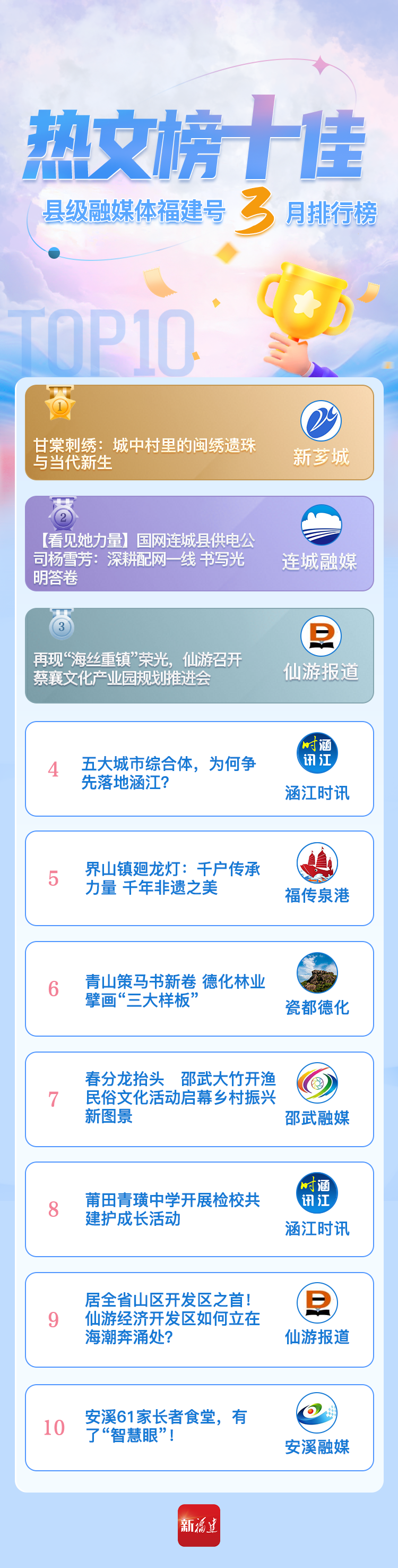 熱文上,“新薌城”的《甘棠刺繡:城中村里的閩繡遺珠與當(dāng)代新生》、“連城融媒”的《【看見她力量】國網(wǎng)連城縣供電公司楊雪芳:深耕配網(wǎng)一線 書寫光明答卷》、“仙游報(bào)道”的《再現(xiàn)“海絲重鎮(zhèn)”榮光,仙游召開蔡襄文化產(chǎn)業(yè)園規(guī)劃推進(jìn)會(huì)》等多篇入圍。“涵江時(shí)訊”“仙游報(bào)道”各有2篇,“邵武融媒”“瓷都德化”“福傳泉港”“新薌城”“連城融媒”“安溪融媒”各有1篇。