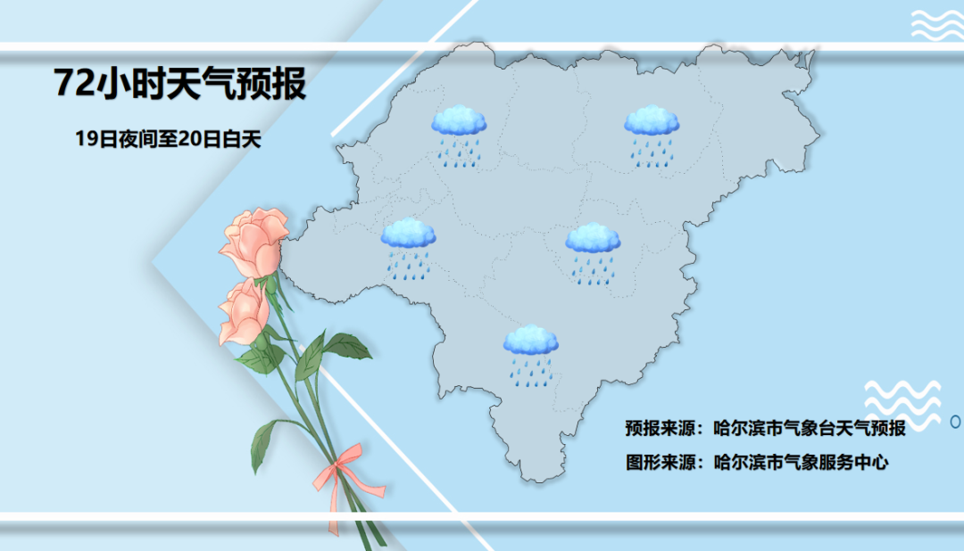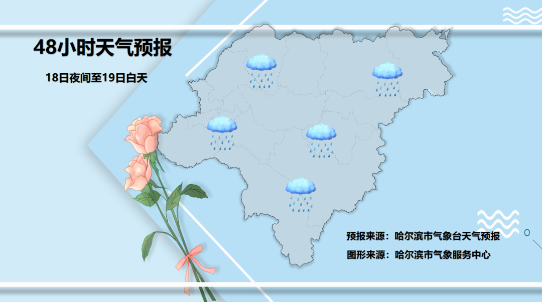 18日夜間至19日白天:全市陰有小雨;偏東風4~5級,陣風6~8級;最低氣溫3~5℃,木蘭、通河、方正、依蘭最高氣溫10~14℃,其他區域18~22℃。