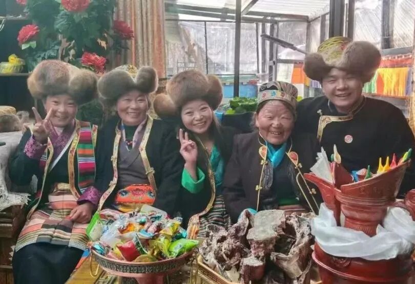 這種飲食上的“混搭”,在拉玉鄉(xiāng)每個(gè)民族通婚家庭里都是尋常的風(fēng)景。堆巴村一組的鄭來運(yùn)來自甘肅積石山,娶了藏族姑娘格桑德吉。如今,他學(xué)會(huì)了做藏式血腸,妻子也學(xué)會(huì)了做甘肅拉條子。今年藏歷新年,一家人既吃古突,又吃餃子;春節(jié)也一樣,既做了年夜飯,也擺了切瑪盒。