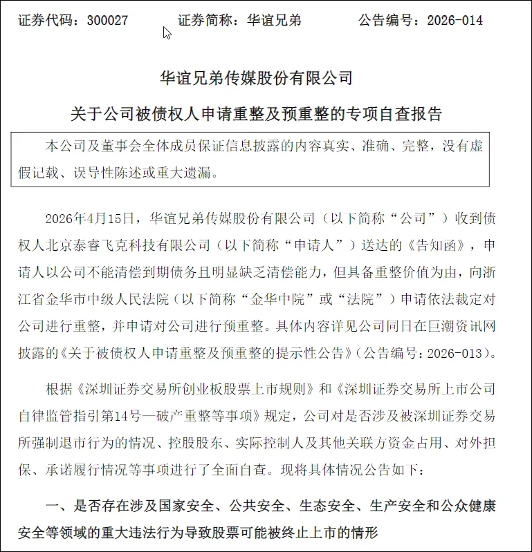 當(dāng)前,華誼兄弟正處于多重風(fēng)險(xiǎn)疊加的關(guān)鍵窗口期。一方面,法院對(duì)重整申請的審查結(jié)果將直接決定公司后續(xù)走向,若受理則公司將進(jìn)入司法重整程序,股票同步實(shí)施退市風(fēng)險(xiǎn)警示;若重整推進(jìn)不順,則可能轉(zhuǎn)向破產(chǎn)清算。另一方面,4月底即將披露的2025年年報(bào)將成為另一道生死線,凈資產(chǎn)最終是否為負(fù),將直接觸發(fā)退市風(fēng)險(xiǎn)警示。