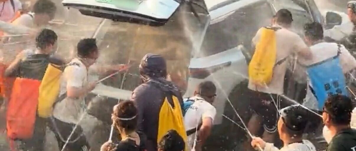 西雙版納潑水節(jié)一汽車車門及后備箱被人拉開,多人向車內(nèi)噴水