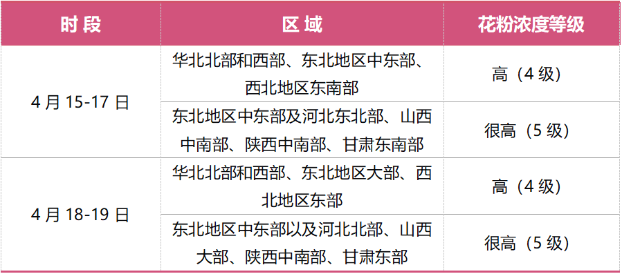 4月15-17日,華北北部和西部、東北地區中東部、西北地區東南部等地的花粉濃度處于高等級(4級),部分地區花粉濃度處于很高等級(5級);18-19日,華北北部和西部、東北地區大部、西北地區東部等地的花粉濃度處于高等級(4級),部分地區花粉濃度處于很高等級(5級)。