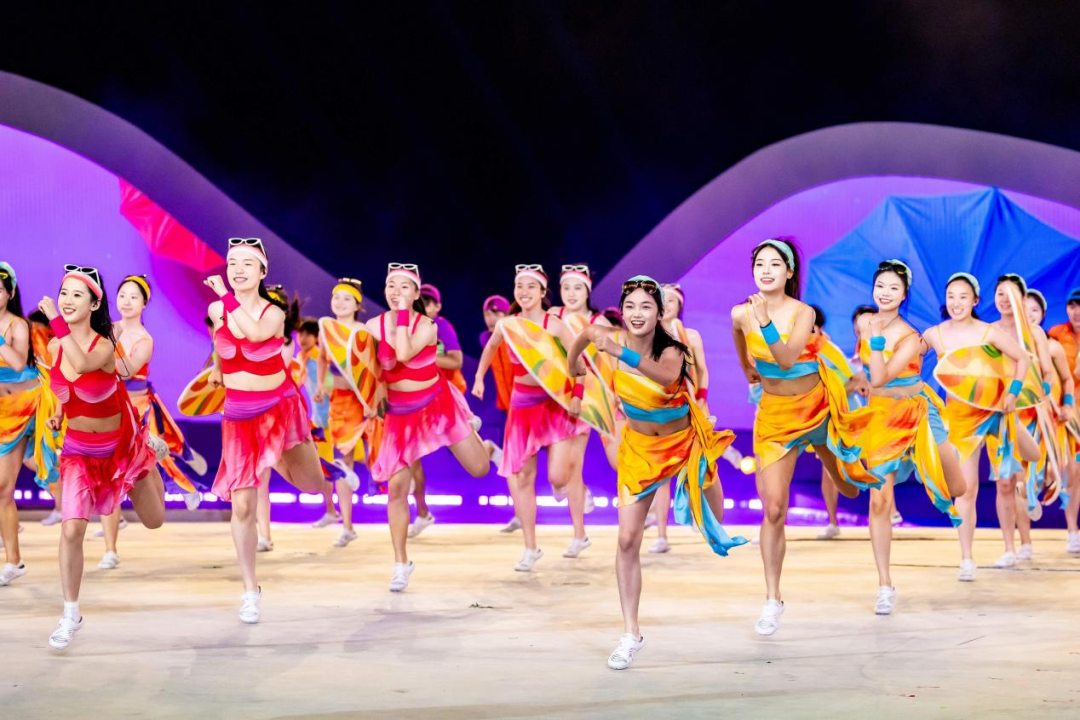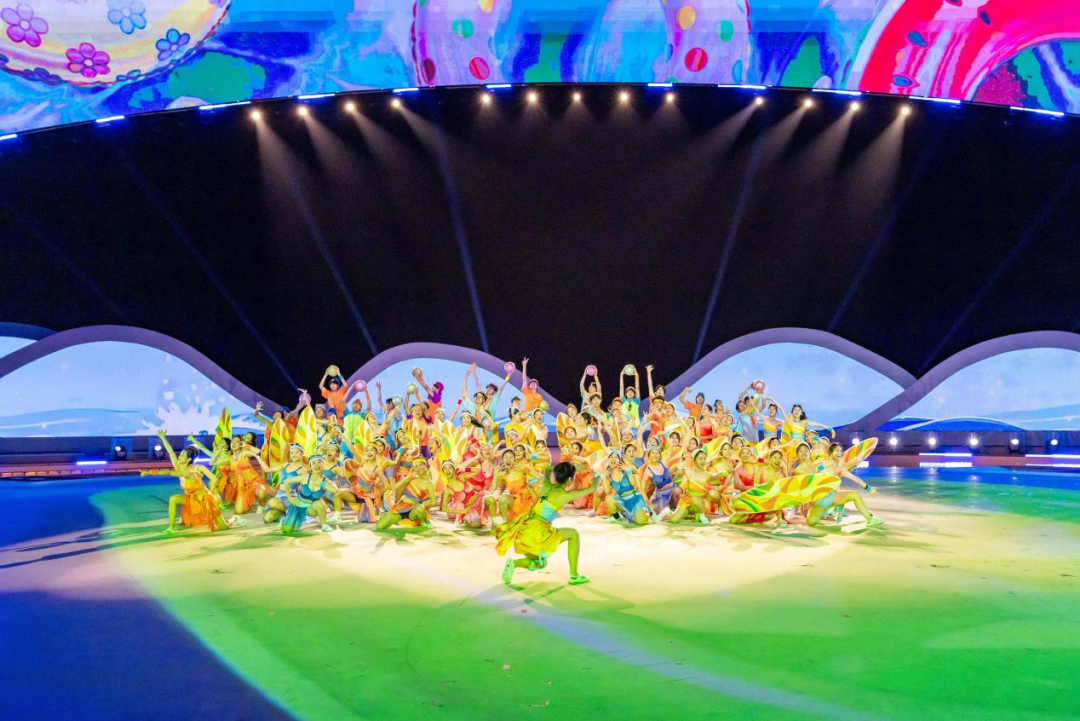 視覺呈現上,開幕式利用長達100多米的地面通道和2000多平方米的中心圓舞臺作為投影載體,通過數字影像與沙灘、海浪的虛實結合,將觀眾的視線融入三亞的天海之間。