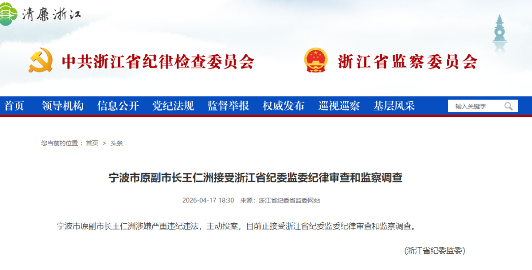 浙江省寧波市原副市長王仁洲涉嫌嚴重違紀違法,主動投案,目前正接受浙江省紀委監委紀律審查和監察調查。