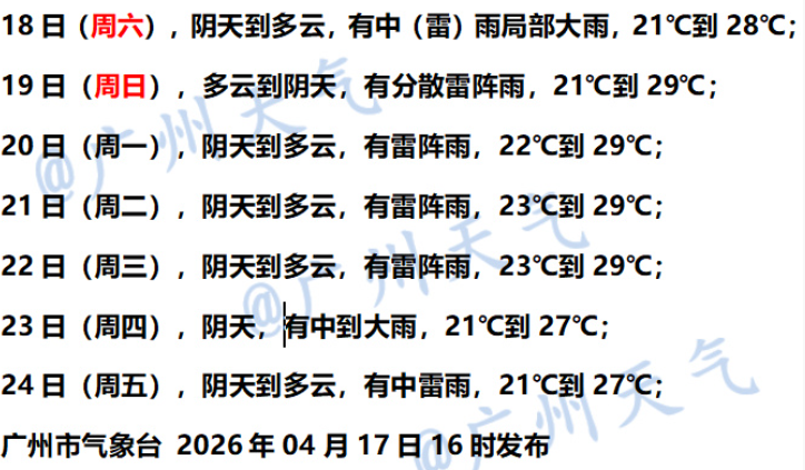 廣州市氣象臺預計,4月18日白天—19日雷雨減弱,以分散雷陣雨為主。20日受南風輻合影響,廣州雷雨增多。
