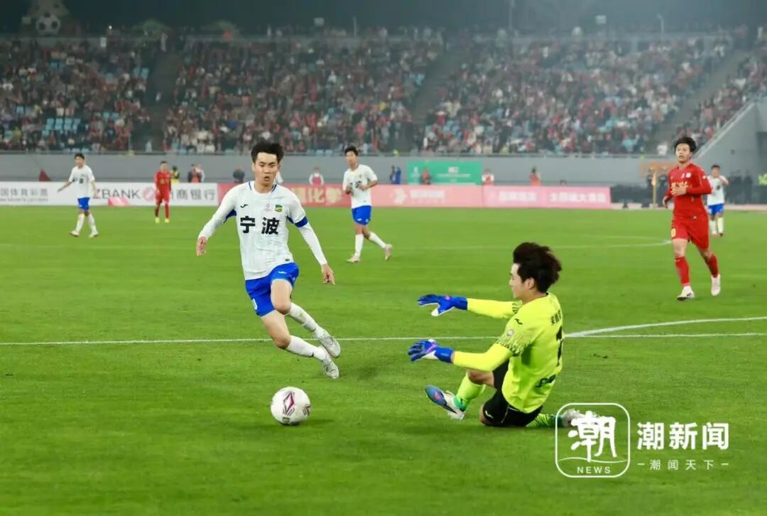 第11分鐘,寧波先拔頭籌! 呂家亮右路像踩了風火輪一樣突入禁區,橫傳門前,王彭泉輕松推射破網。1比0!這是寧波開賽以來第一次率先領先,客場球迷瞬間炸鍋。