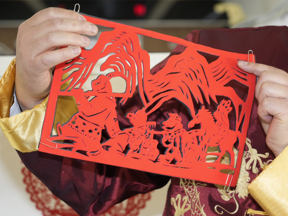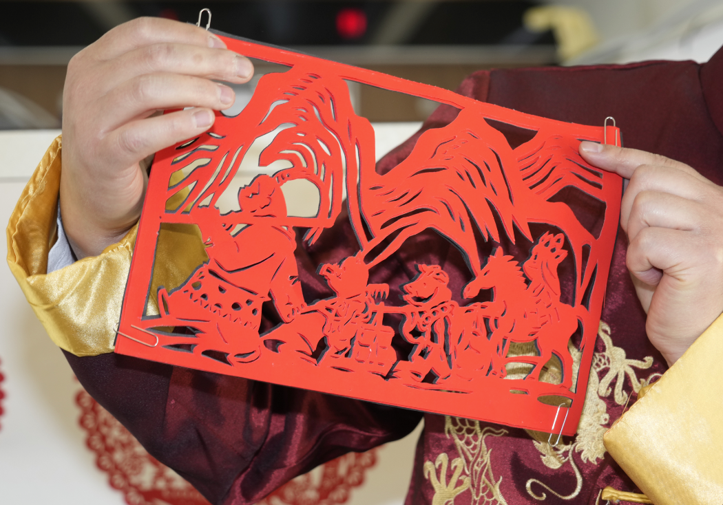 “山西非遺剪紙?zhí)鸷沉耍@項(xiàng)技藝承載著中華民族千年的文化智慧,我要把這幅精美的剪紙作品帶回家,送給孩子留作紀(jì)念?!?/p>