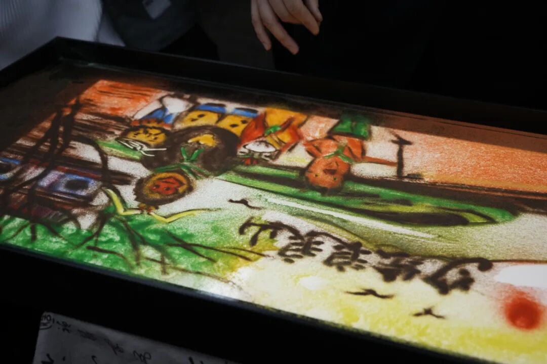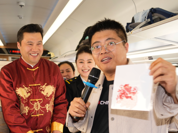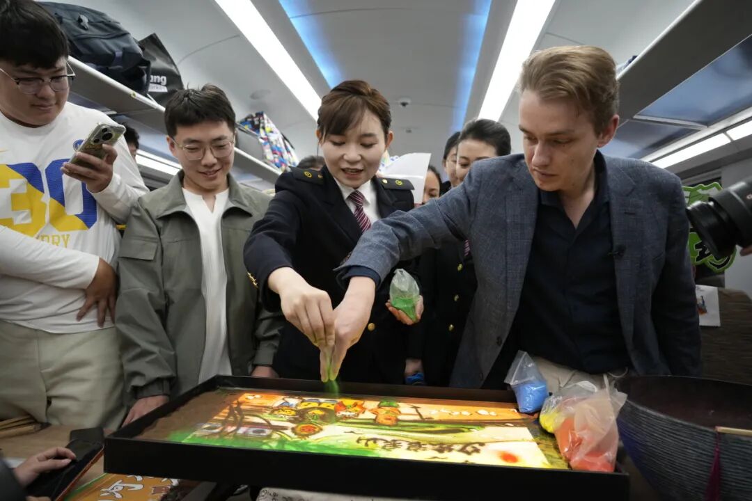 歌曲演唱、非遺剪紙、創(chuàng)意沙畫(huà)、漆扇制作等特色節(jié)目輪番上演,車廂內(nèi)歡笑聲、喝彩聲、掌聲此起彼伏。