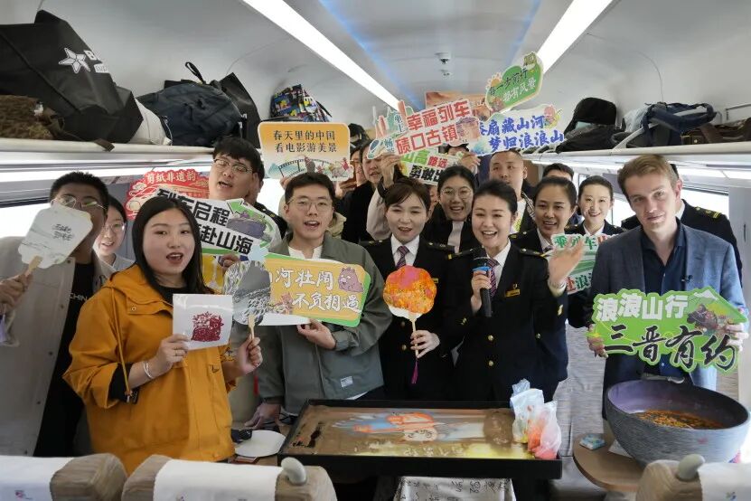 列車長(zhǎng)程丹用流利的英語(yǔ)向外籍旅客講解呂梁風(fēng)土人情與電影背后的文化內(nèi)涵;列車工作人員圍繞影片劇情、經(jīng)典角色、熱門臺(tái)詞與旅客開(kāi)展趣味互動(dòng)問(wèn)答,徹底點(diǎn)燃了全車廂的熱烈氣氛。