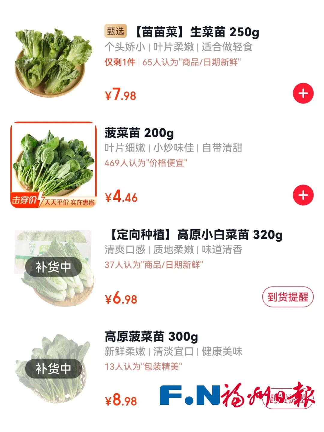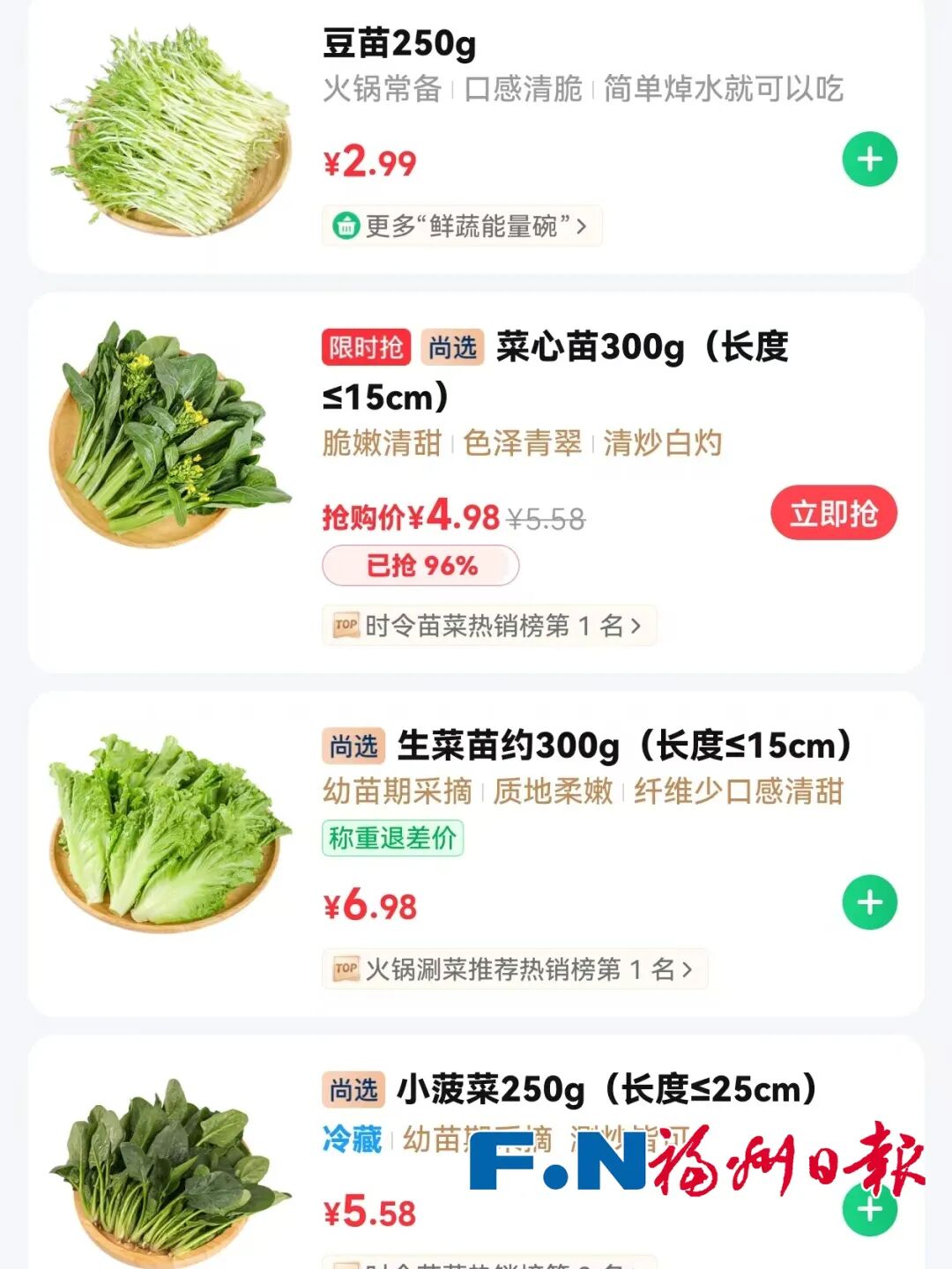 “目前我們平臺在售的‘芽苗菜’約15款,其中豌豆尾、生菜苗、菜心苗、菠菜苗這4款賣得最火。”樸樸超市相關負責人表示,今年一季度,樸樸平臺‘芽苗菜’銷售量同比增長約20%,售出超500萬份。其中,豌豆尾、生菜苗、菜心苗、菠菜苗,成為福州市民回購率最高的“春日頂流”。