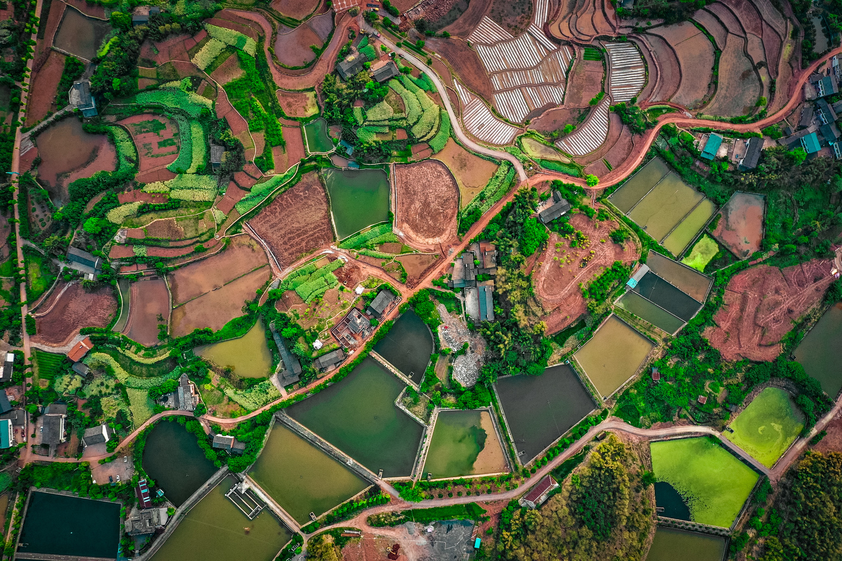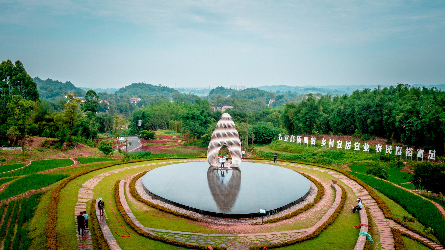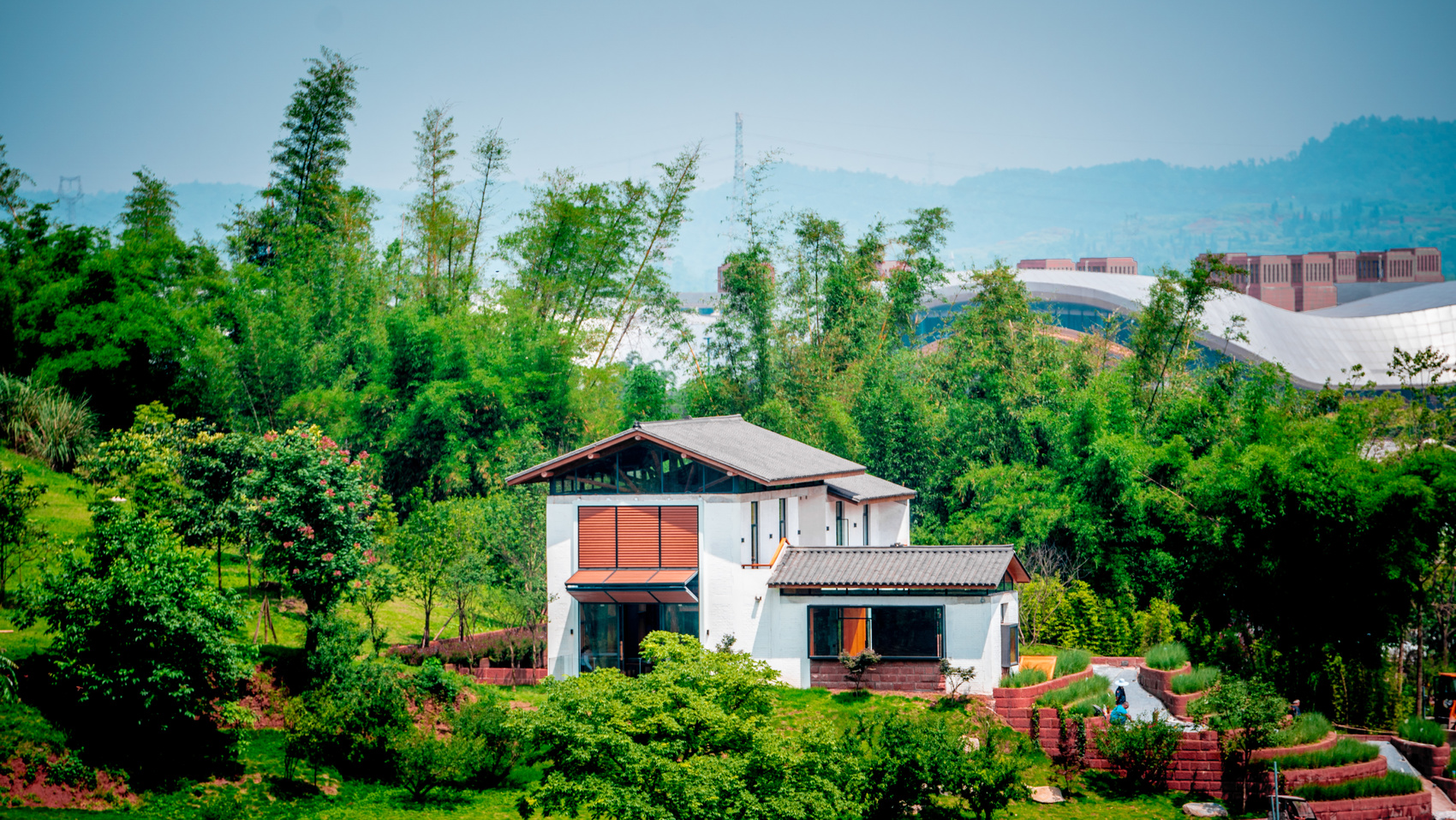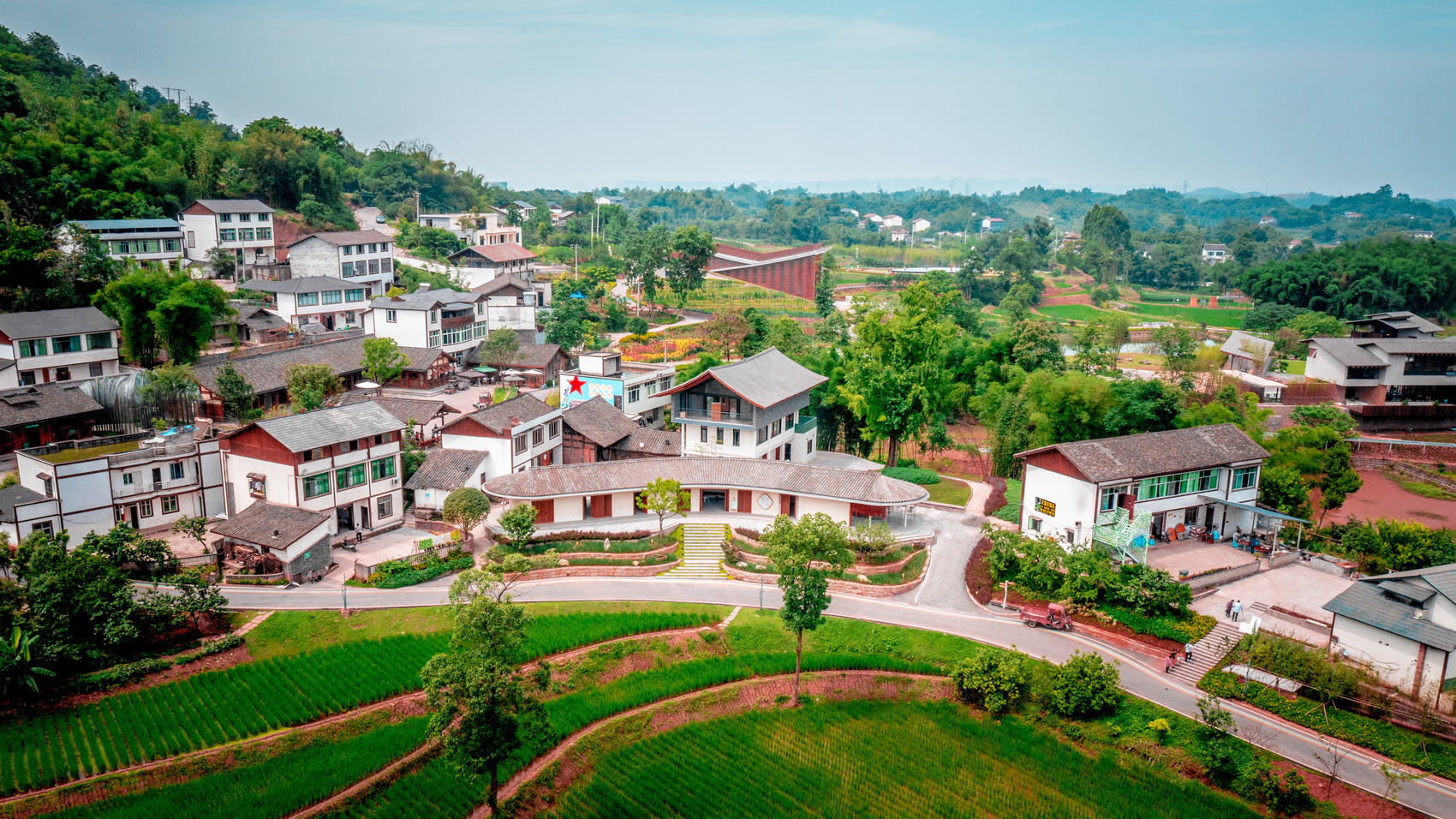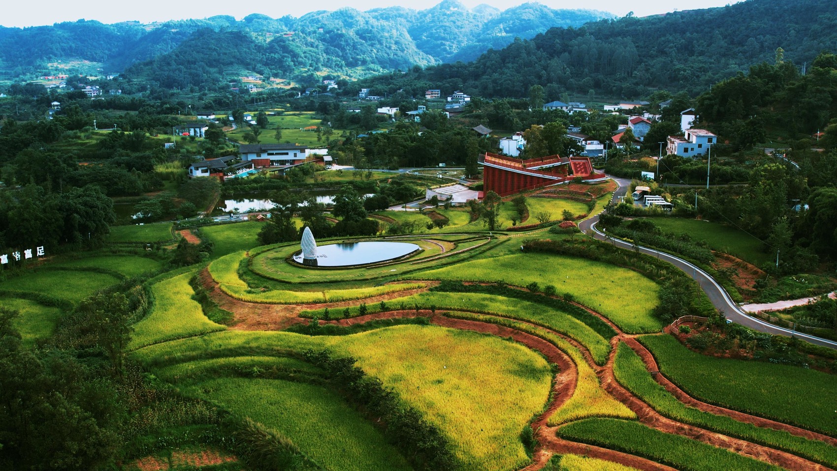 城市設(shè)計(jì)資源的下沉,為鄉(xiāng)村注入了全新動(dòng)能。安石村引入青年先鋒建筑師團(tuán)隊(duì),將紅砂石、穿斗結(jié)構(gòu)等本土元素與“建筑與自然共生”的現(xiàn)代理念相融合,打造出文化中心、半丘塘民宿等標(biāo)志性建筑。這些新增建筑不僅富有美學(xué)價(jià)值,更與梯田、水系、山林等自然肌理和諧共生。文化中心以簡(jiǎn)潔的幾何形態(tài)嵌入田野,外立面采用鄉(xiāng)村常見的紅磚材料與本地紅砂巖元素呼應(yīng),遠(yuǎn)望如從土地中生長(zhǎng)而出;半丘塘民宿依水而建,倒映成景,與周邊魚塘、竹林渾然一體。