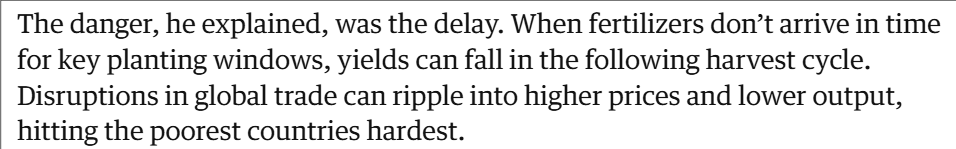 安德烈斯告訴《衛(wèi)報(bào)》,危險(xiǎn)在于延誤。如果肥料不能在關(guān)鍵的種植時(shí)節(jié)及時(shí)送達(dá),那么在接下來(lái)的收獲季里產(chǎn)量就會(huì)下降。全球貿(mào)易的中斷可能會(huì)導(dǎo)致糧食價(jià)格上漲和產(chǎn)量減少,而這種情況對(duì)最貧窮的國(guó)家影響最為嚴(yán)重。