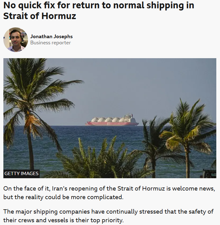 BBC采訪的一位油氣油輪運營商表示,他們覺得不應該冒不必要的風險,在真正確認安全之前,他們不會做第一個穿過海峽的人。大型航運公司均表示,只有在敵對行動長期?;鸬那闆r下,才考慮重返這條關鍵國際航道。