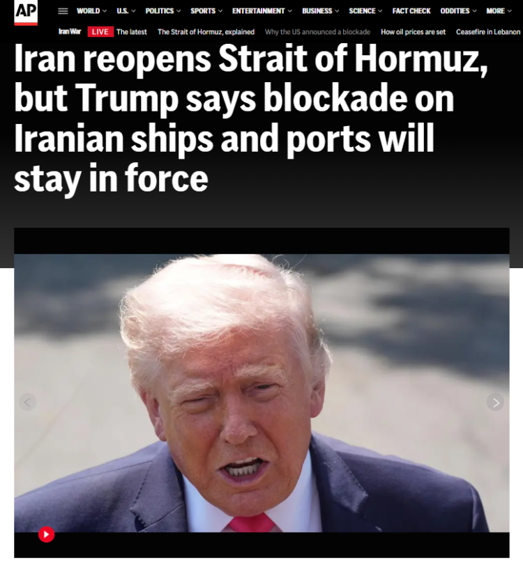 對于伊朗開放霍爾木茲海峽,美國總統特朗普顯然將其視為美國的“勝利”,他當天在接受《今日美國報》電話采訪時稱,與伊朗在霍爾木茲海峽的戰斗已經“結束”,“我們已經取得了一場偉大的勝利”。