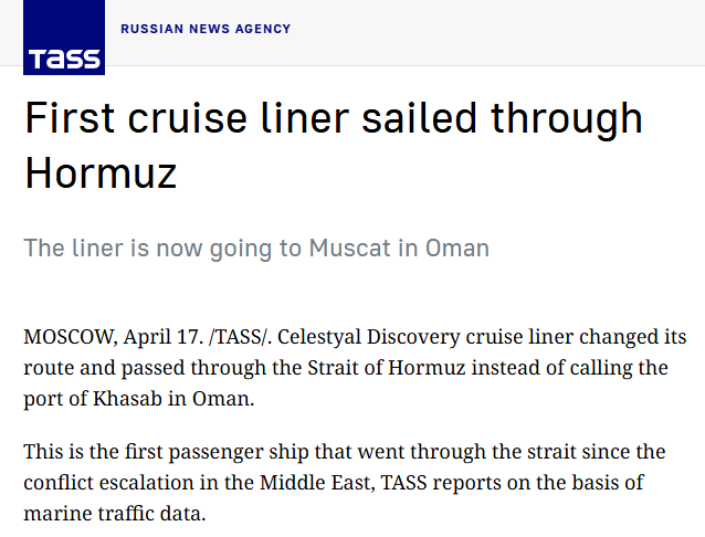 伊朗宣布霍爾木茲海峽對商業船只開放之后,已有少數船只抓緊通行,甚至包括一艘郵輪,這也是美以伊沖突以來第一艘客輪通過海峽。