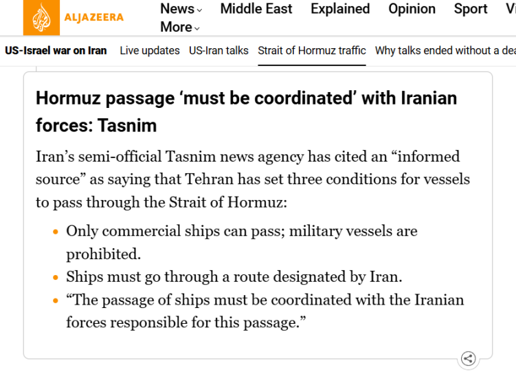 伊朗發布的船只通過霍爾木茲海峽需要協調航線的要求,意味著美國仍在封鎖,而伊方希望通過繼續控制海峽航行來保持杠桿作用,在對美和談中展現力量。