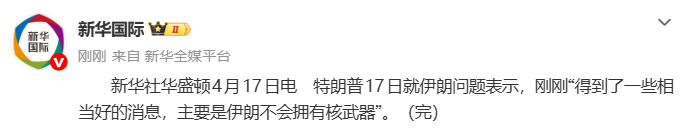 特朗普17日就伊朗問題表示,剛剛“得到了一些相當好的消息,主要是伊朗不會擁有核武器”。