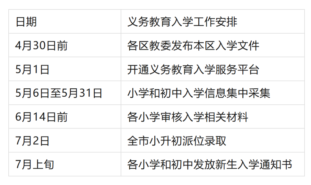 根據北京市義務教育入學工作安排,4月30日前完成小學畢業生信息核對,5月1日起,義務教育入學服務平臺開通,進行入學政策宣傳。5月6日至5月31日,進行小學和初中信息采集。