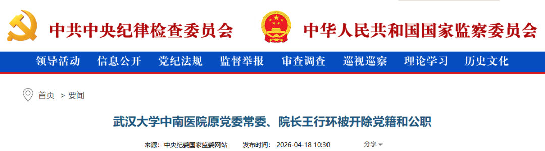 中央紀委國家監委網站訊:經湖北省委批準,湖北省紀委監委對武漢大學中南醫院原黨委常委、院長王行環嚴重違紀違法問題進行了立案審查調查。