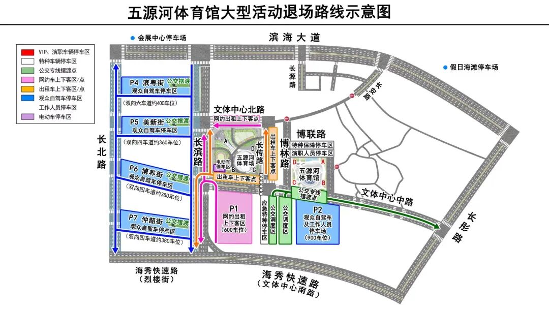 退場時,免費(fèi)公交專線、擺渡線候客區(qū)統(tǒng)一設(shè)置在五源河體育館南側(cè)的文體中心中路公交擺渡停車區(qū);退場時,巡游出租車候客區(qū)設(shè)置在長傳路東半幅和文體中心中路北半幅;網(wǎng)約車候客區(qū)設(shè)置在P1停車場和文體中心北路北半幅。(詳見示意圖)