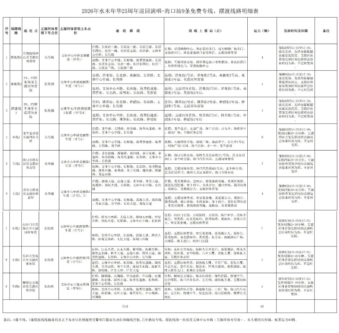 為做好演出活動的配套服務(wù)保障,海口公交為本次活動臨時開通9條演唱會免費(fèi)專線(其中3條擺渡線)。在本次活動前后,為歌迷朋友們提供方便、快捷、舒適的出行服務(wù)。