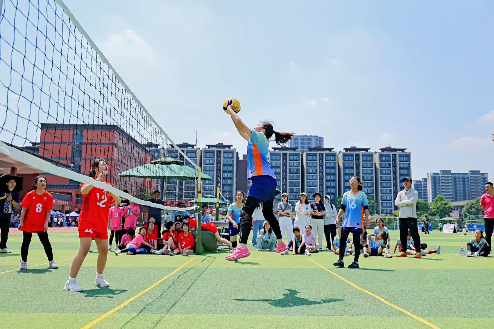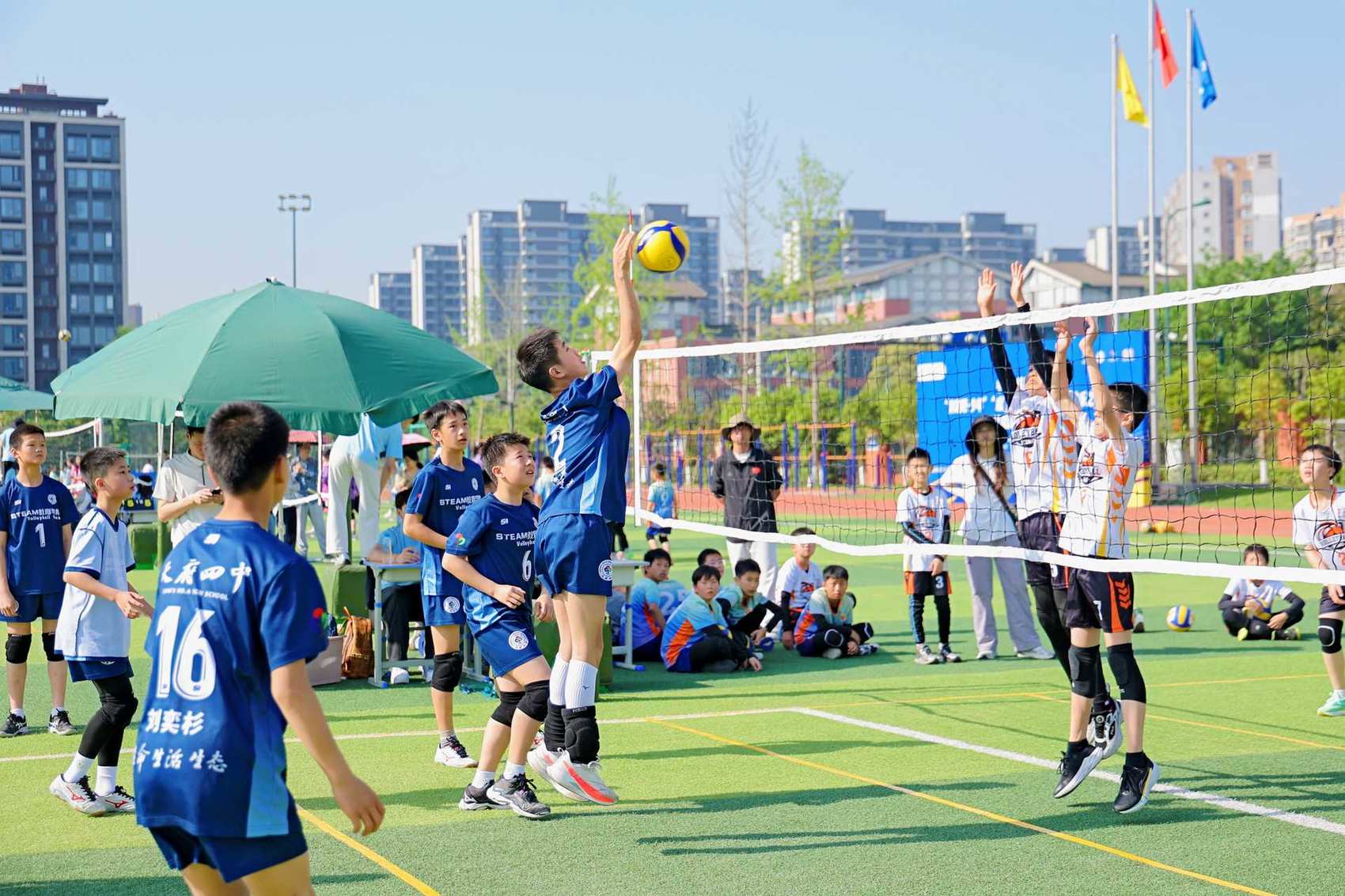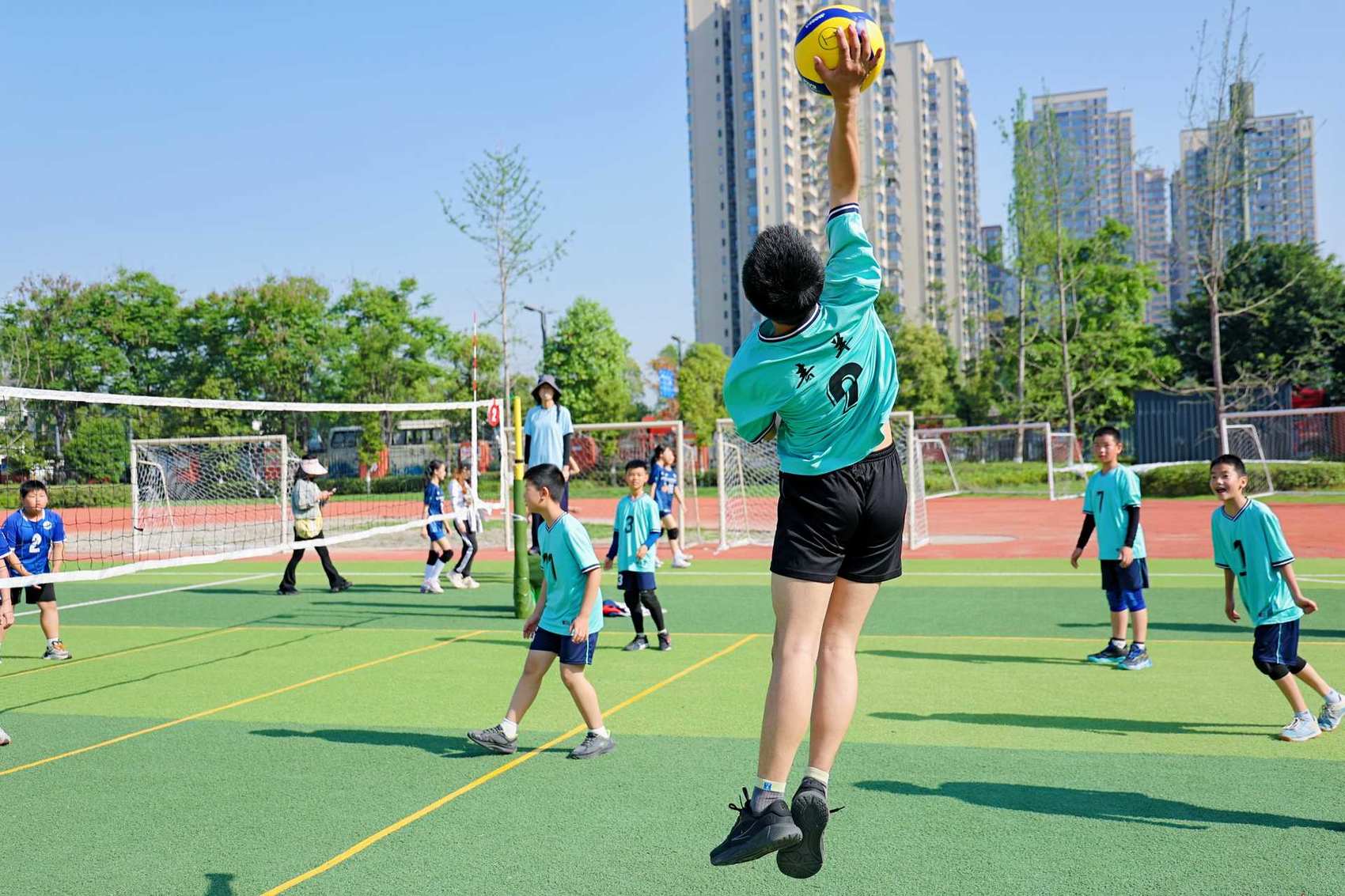 比賽現場,124支參賽隊伍分為男子甲組、女子甲組、男子乙組和女子乙組4個組別,各場次比賽同步在10片場地舉行。在全新的比賽規則之下,小運動員們在網前跳躍、揮臂扣殺、飛身撲救,稚嫩的臉龐上寫滿專注與拼搏,清脆的吶喊聲和歡笑聲交織回蕩,盡顯青春活力。