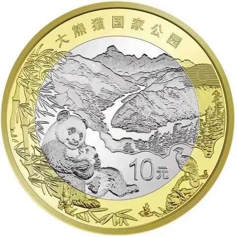 大熊貓國家公園普通紀念幣的背面主景圖案為大熊貓母子和四姑娘山等自然風光,輔以綠尾虹雉、竹林等。