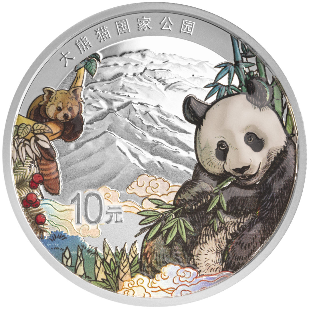 30克銀幣背面,大熊貓與小熊貓遙相呼應,珙桐、紅豆杉等珍稀植物環繞四周,背景是瓦屋山、四姑娘山等川西名山的巍峨身影。