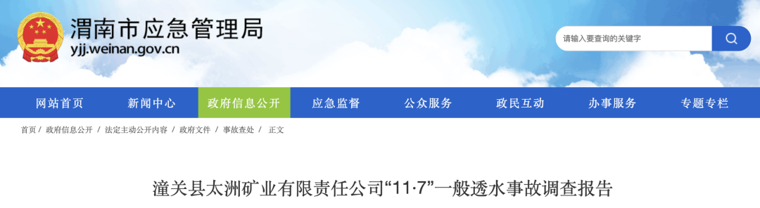 4月16日,陜西省渭南市應急管理局官網公布《潼關縣太洲礦業有限責任公司“11·7”一般透水事故調查報告》(下稱《報告》),披露了2025年11月7日潼關縣太洲礦業有限責任公司(下稱:太洲礦業)透水事故的相關情況。