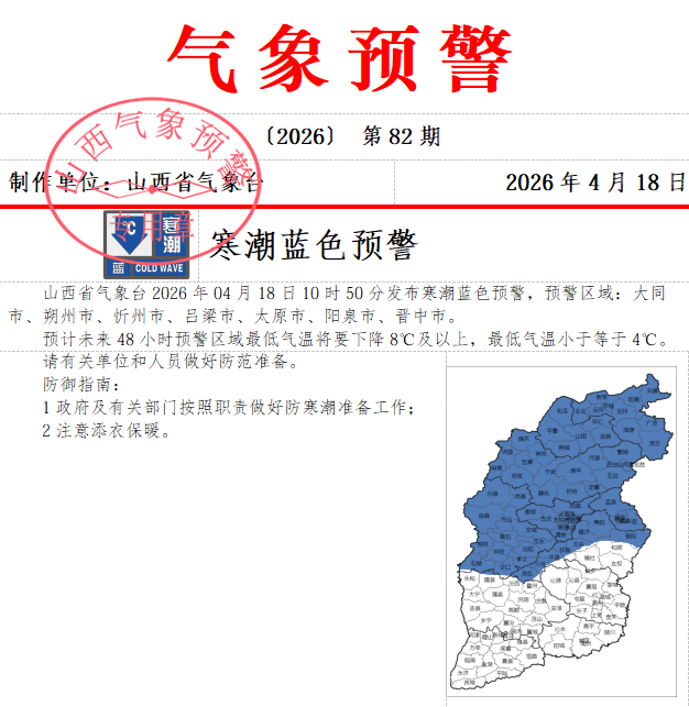 山西省氣象臺2026年04月18日10時50分發布寒潮藍色預警,預警區域:大同市、朔州市、忻州市、呂梁市、太原市、陽泉市、晉中市。