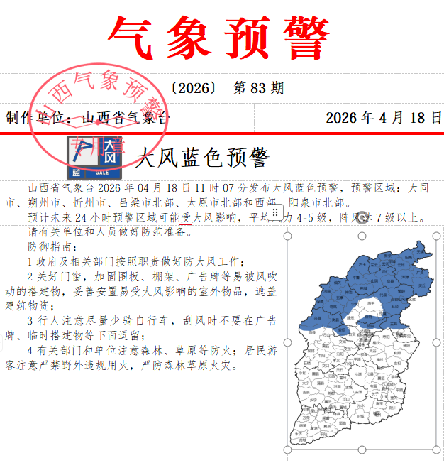 山西省氣象臺2026年04月18日11時07分發布大風藍色預警,預警區域:大同市、朔州市、忻州市、呂梁市北部、太原市北部和西部、陽泉市北部。