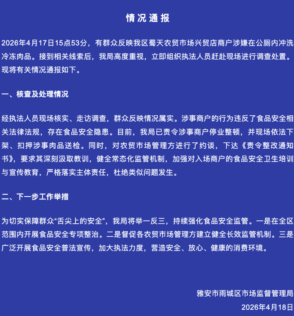 4月17日15點53分,有群眾反映我區蜀天農貿市場興貿店商戶涉嫌在公廁內沖洗冷凍肉品。接到相關線索后,我局高度重視,立即組織執法人員趕赴現場進行調查處置。