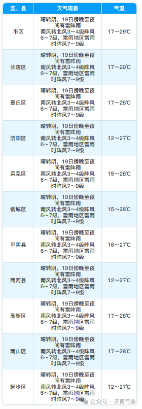受高空槽影響,預計19日傍晚到夜間,濟南市自西向東有一次強對流天氣過程,伴有大風和降溫天氣。