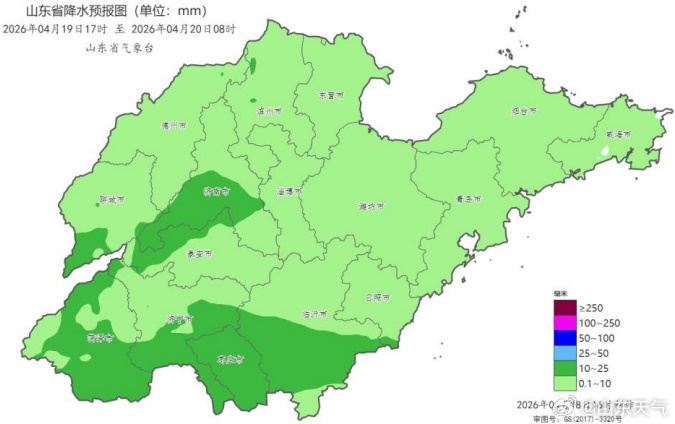 山東省氣象臺于4月18日16時發布強對流天氣預報和海上大風警報:受高空槽影響,預計19日傍晚到夜間,我省自西向東將出現一次強對流天氣過程,并伴有雷電和7~9級局部10級以上的雷雨陣風。我省大部地區有小雨,魯南和魯中的部分地區有中雨,累積平均降水量3~8毫米,局部降水量可達20毫米以上。